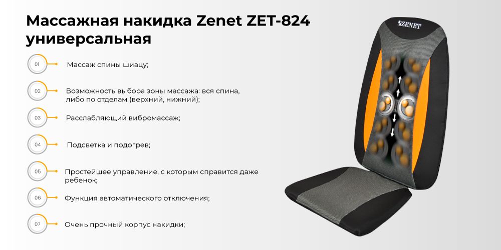 Массажная накидка ZENET ZET-824 гармонично будет смотреться на большинстве кресел. Накидку нужно подключать к сети 220 В. Несколько режимов работы достаточны для проведения массажа, способного расслабить уставшие мышцы. Рекомендуем купить массажную накидку ZENET ZET-824 и пользуйтесь ею дома, на работе, в машине!