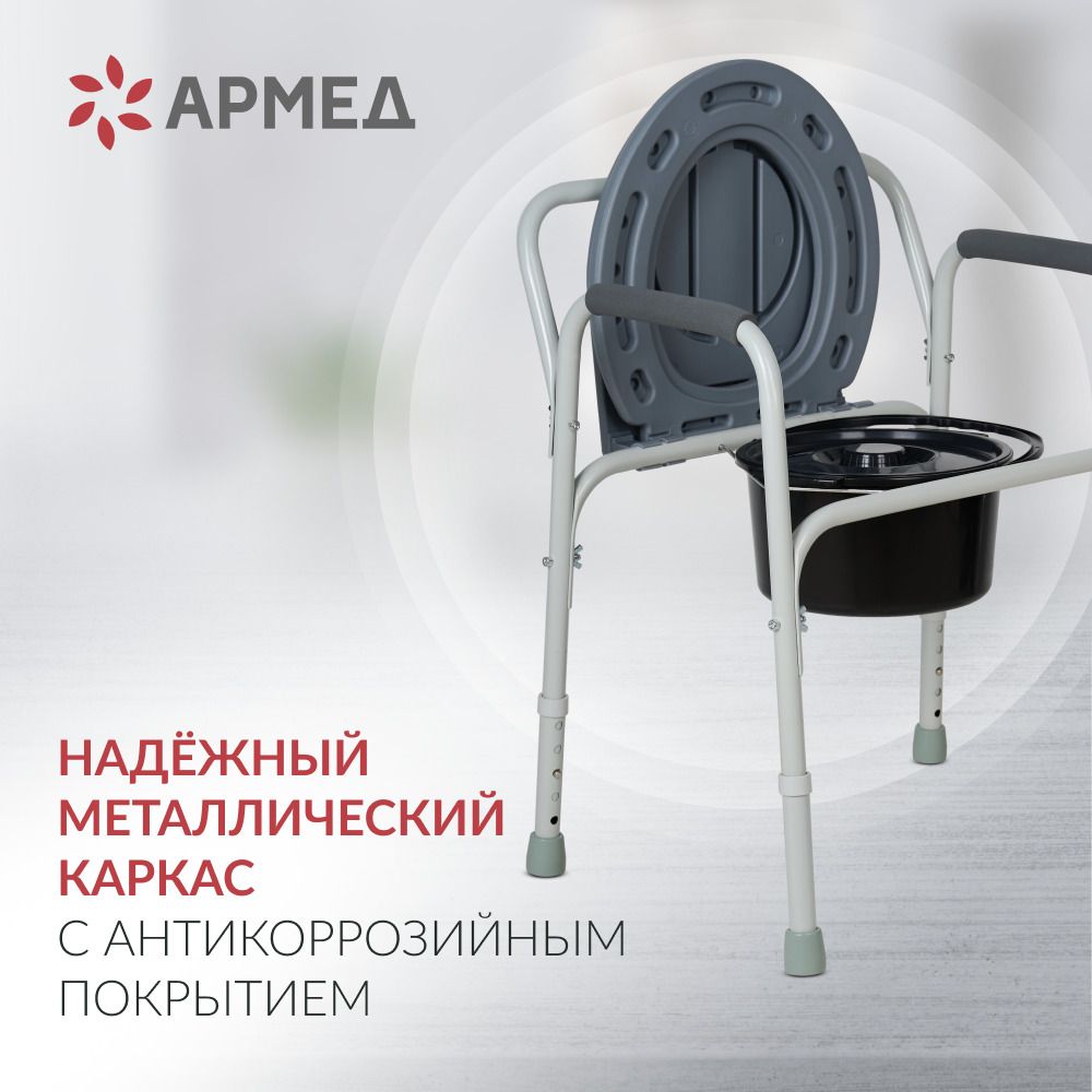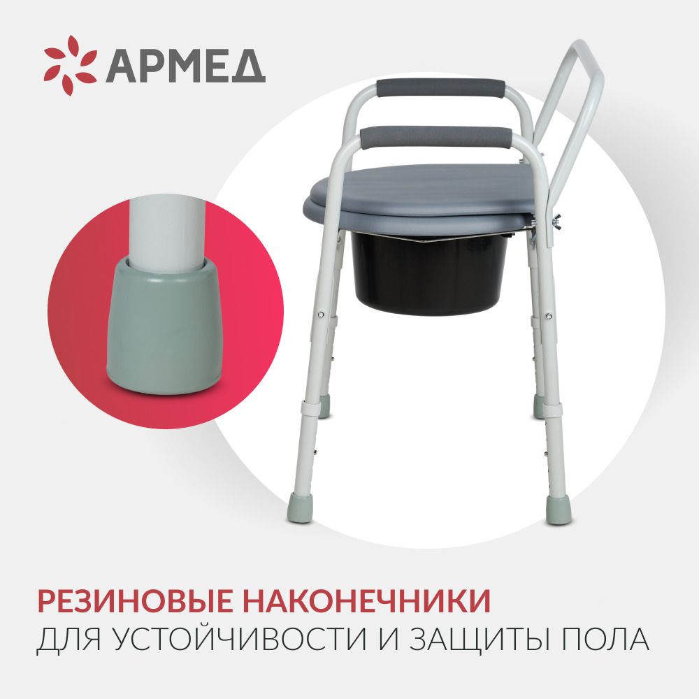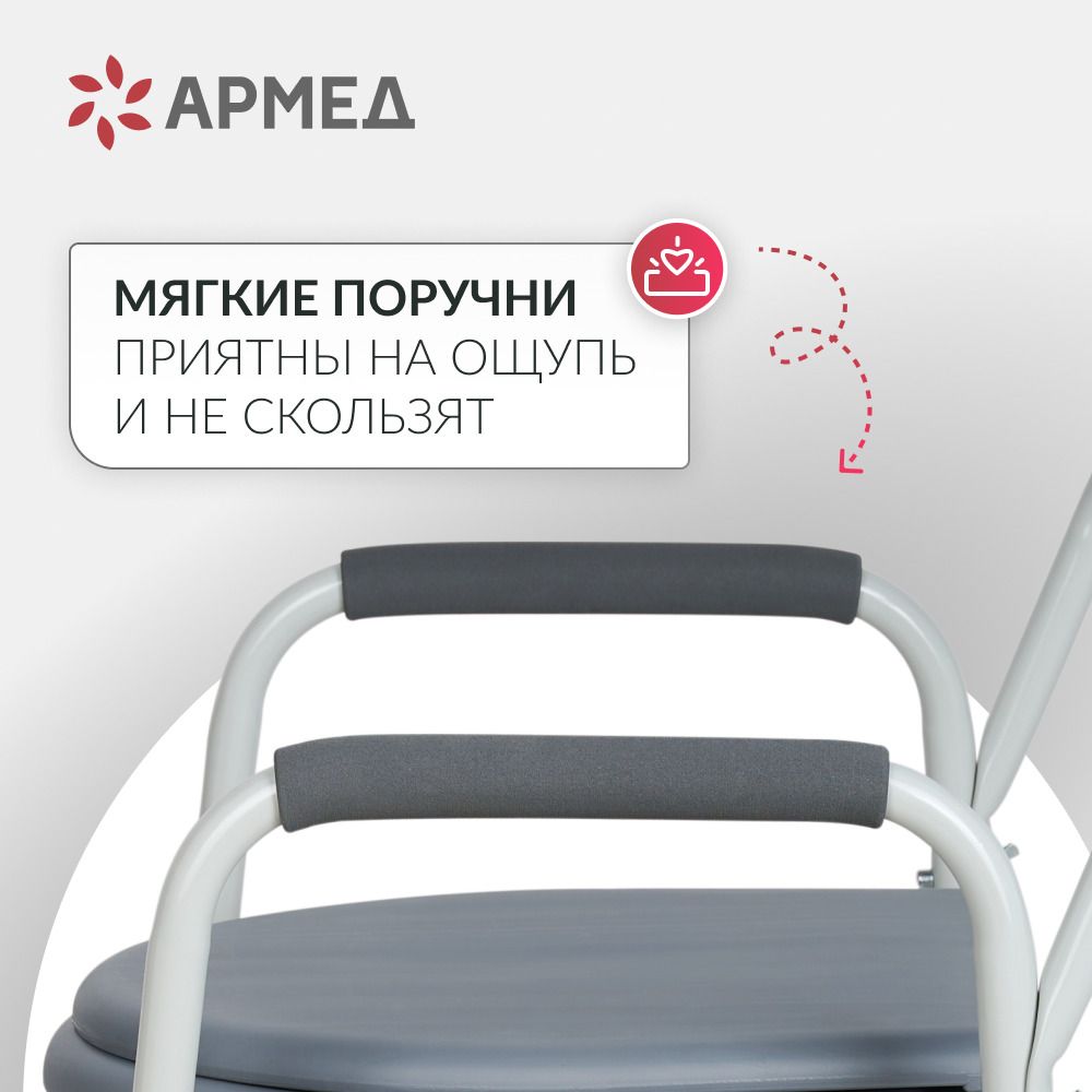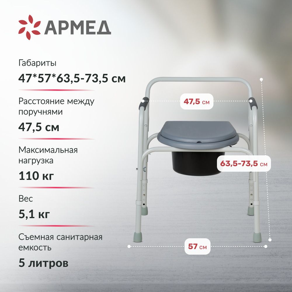 Кресло инвалидное Армед ФС810 - модель, оборудованная съемной санитарной емкостью, откидным стульчаком и удобными подлокотниками. Высота ножек легко регулируется. Ширина сиденья подходит для людей средней комплекции.