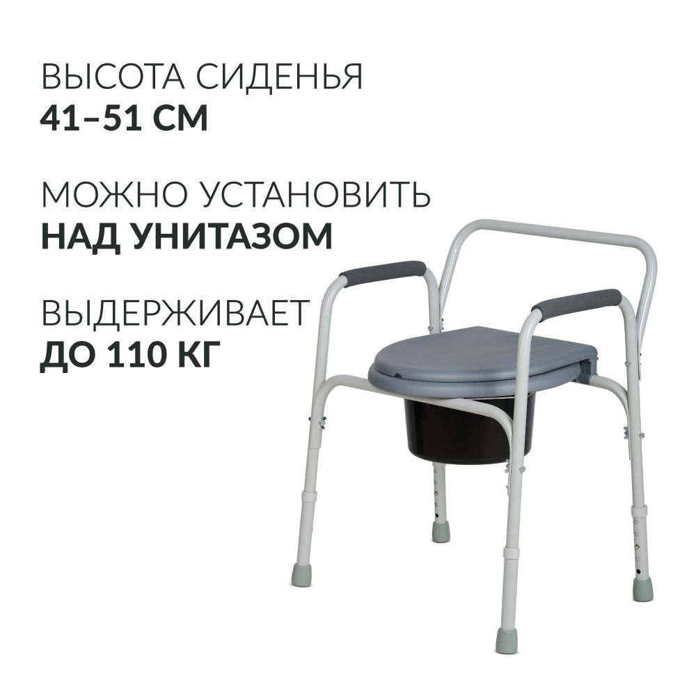 Стул можно использовать автономно для санитарно-гигиенических нужд, а также в туалете путем установки изделия на унитаз. Для устойчивого положения изделия предусмотрены резиновые наконечники.