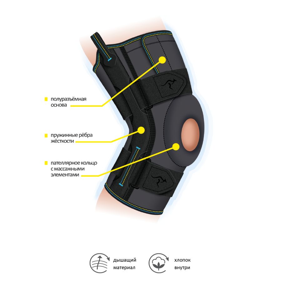 - поддерживает коленную чашечку при помощи пателлярного кольца, а массажные ребра на нем улучшают местное кровообращение, что ускоряет процесс восстановления;