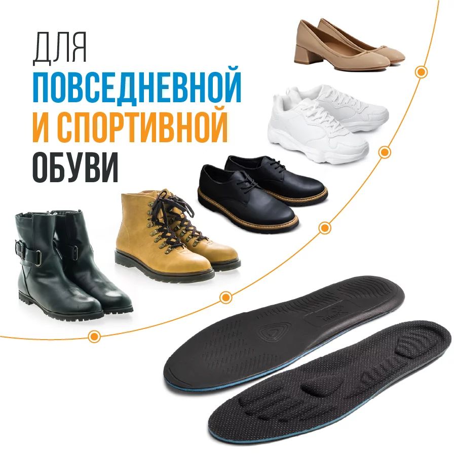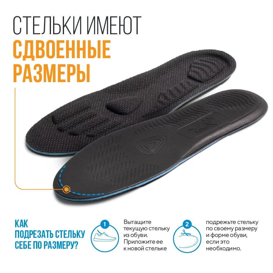- стельки имеют сдвоенные размеры, их можно подрезать в носочной части под форму обуви